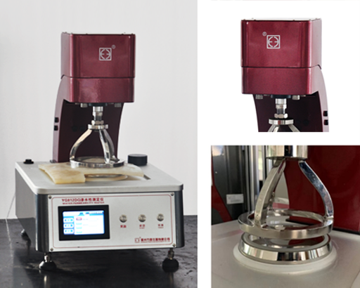 按FZ/T 01004-91標準規定的C法。壓力范圍0-100KPa,夾頭直徑113mm( 必要時可用直徑為31.5mm的夾頭)。勻速增壓,壓力上升到預定壓力值( 10-1100 kPa) 停機,記下從達到預定壓力值起直到不接觸水的一面出現第一滴水珠止,所需的時間( s)。